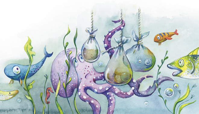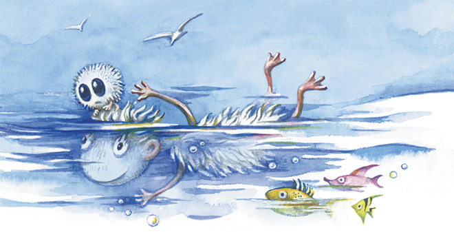Когда Крокка подплыл к дому друга, то забыл про пассажира и поднырнул до двери в Воккину комнату. Советчик не растерялся и вцепился в ухо крепко-накрепко – так, что Крокка сразу про него вспомнил. А ещё Советчик попробовал глядеть вдаль под водой. Получалось куда таинственней!