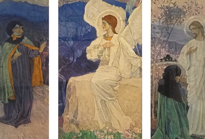 М. В. Нестеров. Утро Воскресения. Триптих: Мироносица, Ангел на гробе и Мария и Христос