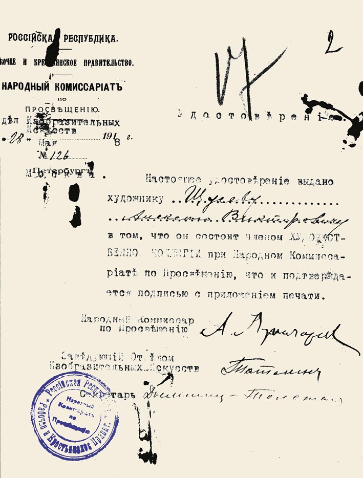 Удостоверение, выданное народным комиссаром просвещения А. В. Луначарским художнику А. В. Щусеву, в том, что он является членом художественной коллегии Наркомпроса