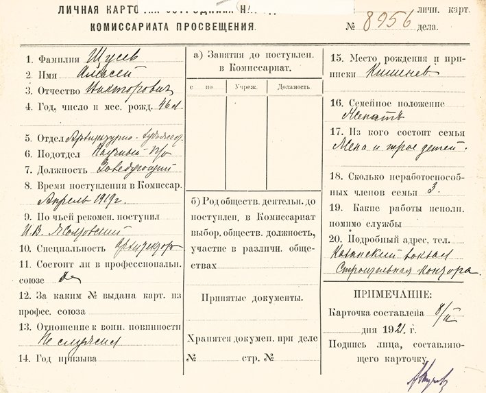 Личная карточка А. В. Щусева в Наркомпросе