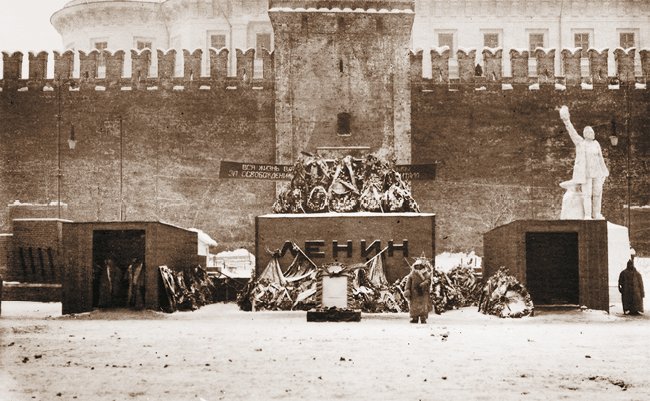 Утром дня похорон возвели верхнюю часть мавзолея, представляющую собой серого цвета куб, обшитый елочкой, как кладут паркет, высотой в три метра, по бокам по пять метров, наверху три уступа, создающие вид ступенчатой пирамиды, по фасаду крупными черными брусками: «ЛЕНИН». Слева и справа установили деревянные вестибюли, в один входишь, из другого выходишь, но правый только начали обустраивать изнутри, когда прибыл сам Дзержинский и сказал:
