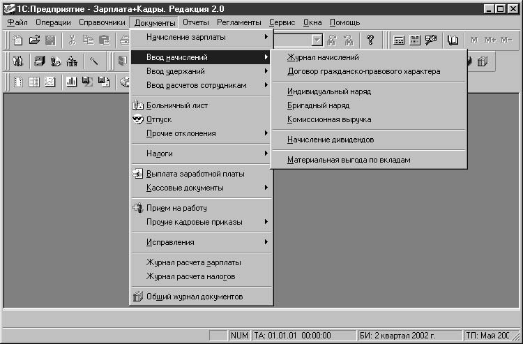 Описание объекта учета ни к чему не обязывает пользователя, пока не задано действие с описанным объектом. Все действия или операции задаются документами, причем большинство из них связаны с вводом первичных документов. Перечень документов для формирования операций с объектами задается в меню Документы (рис. 1.2).