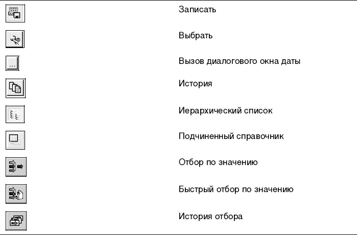 Для всех компонентов программы определены общие действия, которым назначены определенные кнопки. Желательно запомнить эти кнопки сразу, хотя всегда есть возможность обратиться к меню Действия и выбрать нужное действие из него. Навыки работы с правой клавишей мыши позволяют быстро вызвать это же меню в любом месте окна. В дальнейшем мы будем пользоваться названиями кнопок, приведенными рядом с изображением. Изображения кнопок и соответствующие им действия представлены в табл. 2.1.