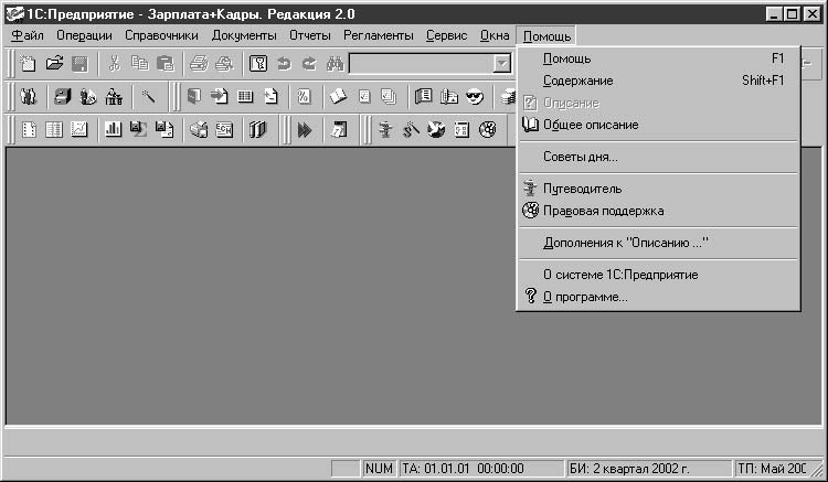 Меню Помощь используется в том случае, когда необходимо получить описание режимов и методов работы с открытым окном. Окна одинаковых компонентов, например, справочники, имеют одинаковые панели инструментов и одинаковые режимы и методы работы в них. Если режим в выбранном справочнике не используется или для текущего элемента недоступен, то соответствующая кнопка не активна. Поэтому дается общее описание для всех элементов компонента. Например, для справочника "Сотрудники" будет предложено описание "Справочники", как, впрочем, и для всех остальных справочников.