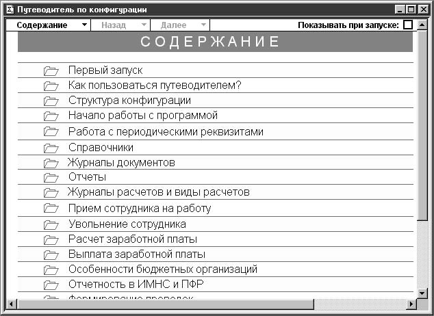 Путеводитель (рис. 2.5) поддерживает начинающего пользователя на протяжении всего сеанса работы. При желании диалоговое окно Путеводитель по конфигурации можно закрыть и продолжать работу без его помощи. Вызов Путеводителя осуществляется выбором пункта Путеводитель меню Помощь или с помощью кнопки