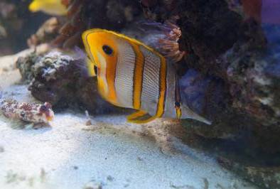 Иногда даже вокруг своей оси переворачивается, пока ищет – носом вниз. Из-за вертикальной полоски на глазах заметно, как он "обшаривает" взглядом все окрестности, и когда залезает под нижнюю ветку разлапистого коралла (тельце свое плашмя повернув) и оттуда, легко помахивая плавничками и хвостиком, разглядывает меня через стекло, ожидая кормления – впечатление то еще… !
