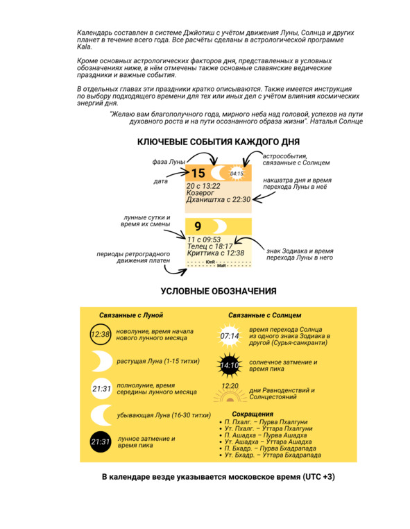 Особое внимание уделено славянским (языческим) праздникам и важным событиям. Они отмечены соответствующими условными обозначениями в каждом месяце, а в отдельной главе приведены краткие описания их значения и традиций.