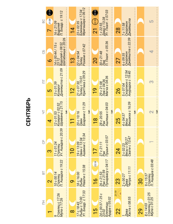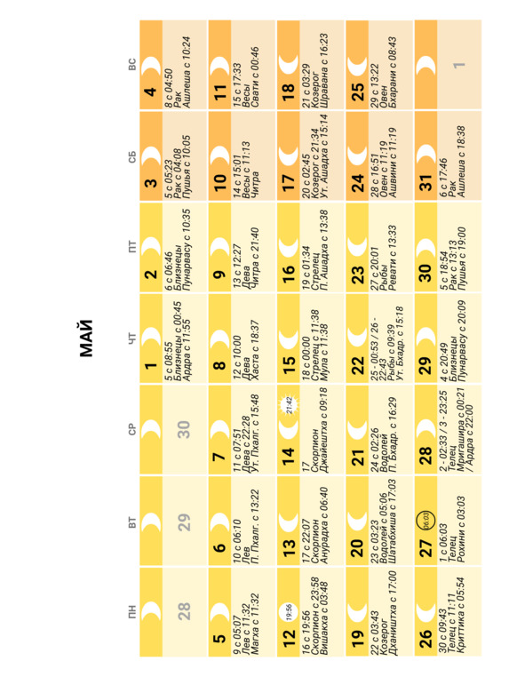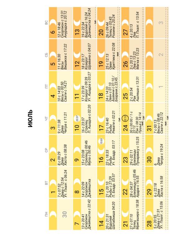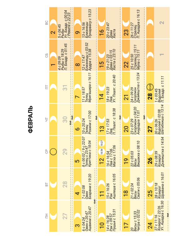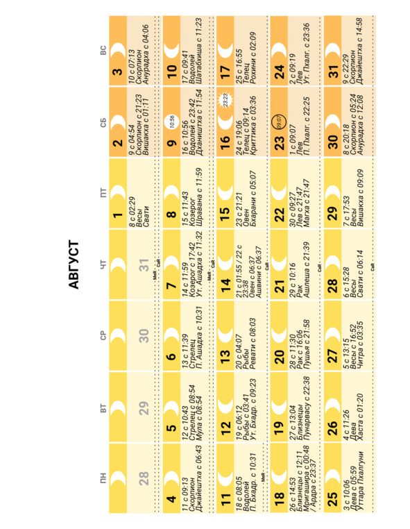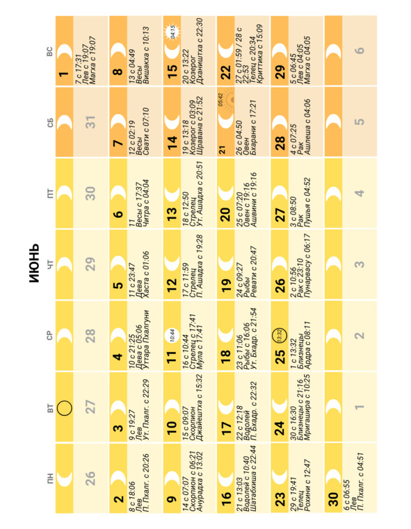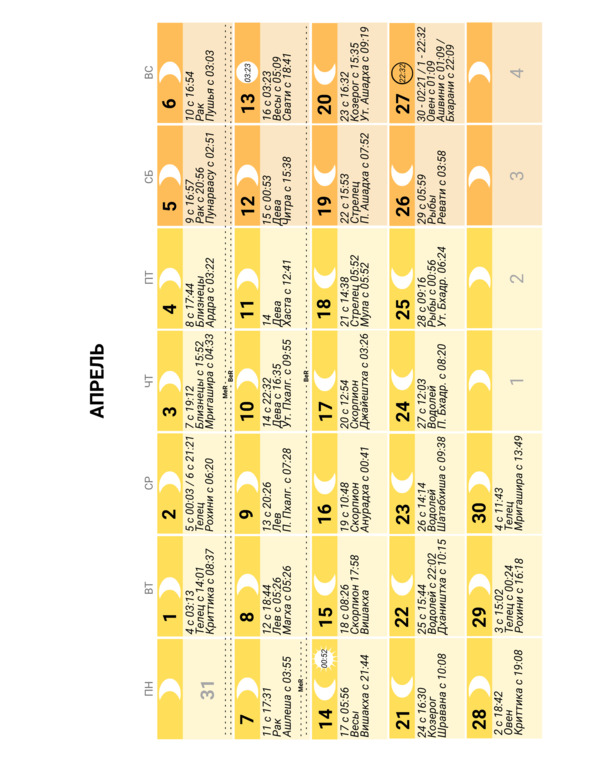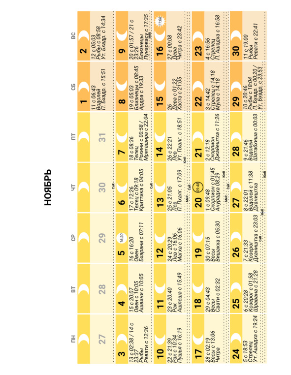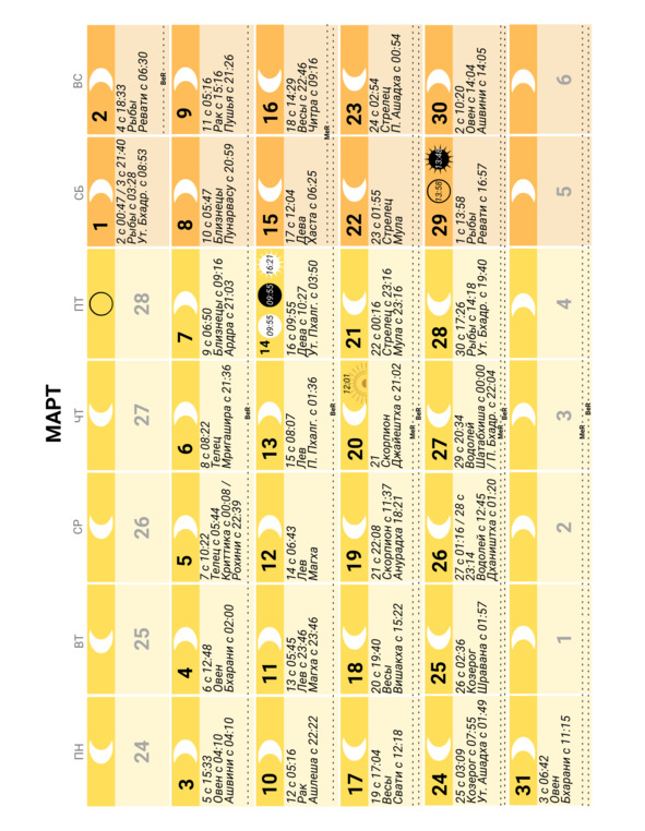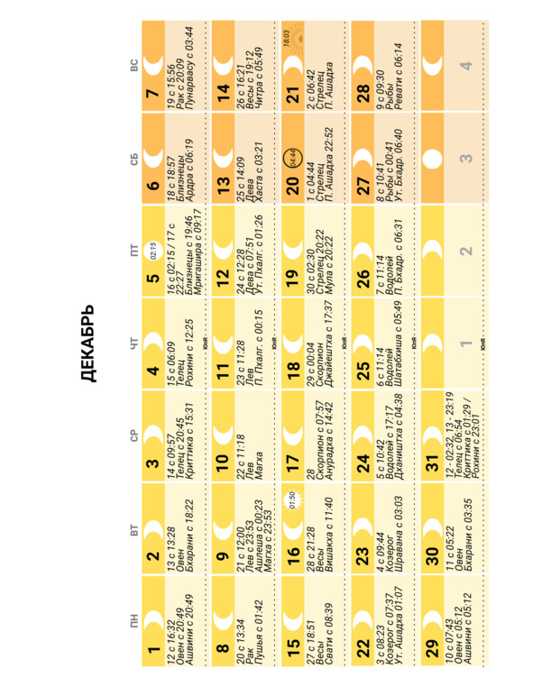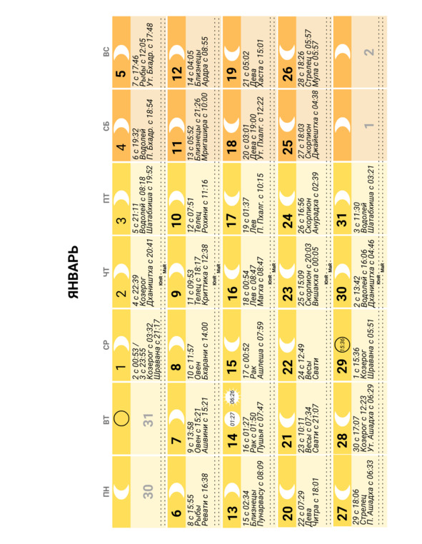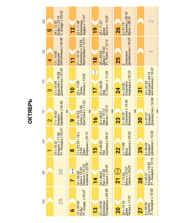 – положение Луны в знаке Зодиака и накшатре (лунное созвездие) и время смены одних на другие;