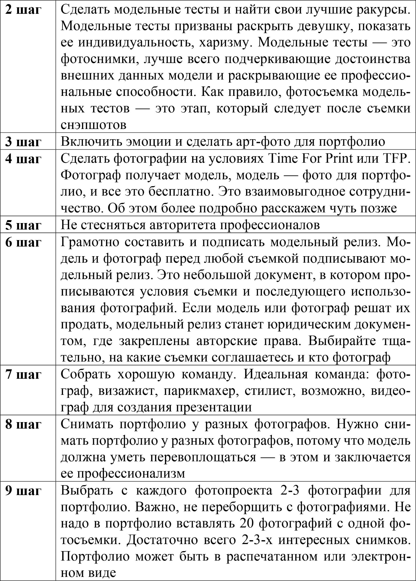 Все модели хотят иметь крутое портфолио, потому что без портфолио нет шансов на контракт, например, с зарубежным модельным агентством. Есть широко известные в мировой практике шаги для создания крутого портфолио, которые представлены в таблице 1.