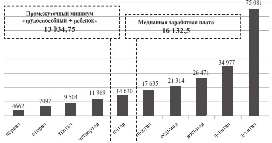 Размер минимальной заработной платы следует приблизить к величине не ниже 40 % от средней заработной платы по стране; размер средней заработной платы должен составлять 5–6-кратную величину от прожиточного минимума, для чего требуется существенно увеличить объем заработной платы57.