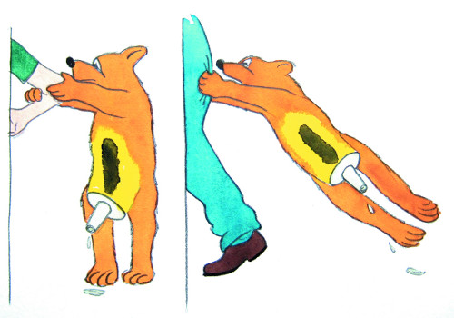 Auffallend ist wiederum die Lautstärke, mit der er auf sich aufmerksam zu machen pflegt, sobald er eines anderen Bären ansichtig wird. Dieses Imponiergehabe beansprucht einen großen Teil seiner Gehirnleistung. Er ist deshalb leicht einzufangen, da er unvorsichtig ist und zu gerne in ihm gestellte Fallen tappt.