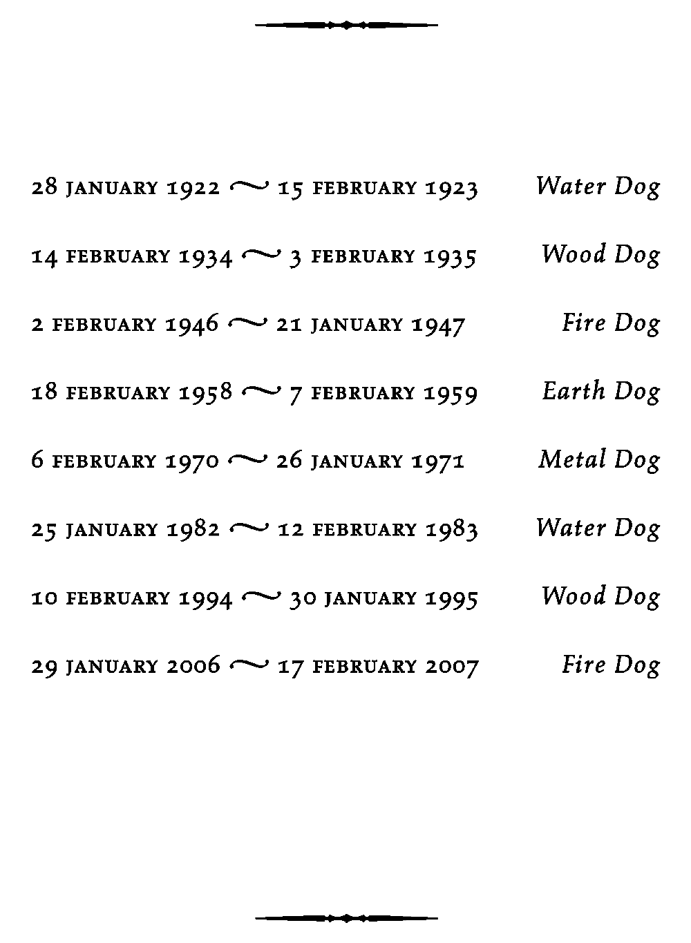 In addition to the 12 signs of the Chinese zodiac there are five elements and these have a strengthening or moderating influence on the signs. The effects of the five elements on the Dog are described below, together with the years in which they were exercising their influence. Therefore Dogs born in 1970 are Metal Dogs, Dogs born in 1922 and 1982 are Water Dogs, and so on.