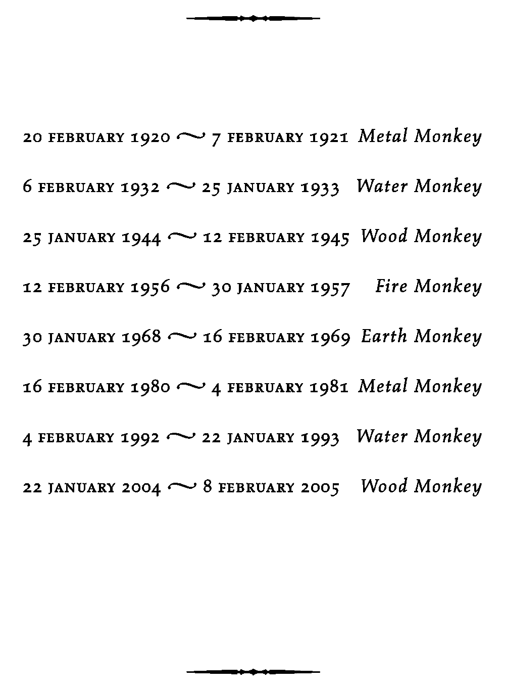 In addition to the 12 signs of the Chinese zodiac there are five elements and these have a strengthening or moderating influence on the signs. The effects of the five elements on the Monkey are described below, together with the years in which they were exercising their influence. Therefore Monkeys born in 1920 and 1980 are Metal Monkeys, Monkeys born in 1932 and 1992 are Water Monkeys, and so on.