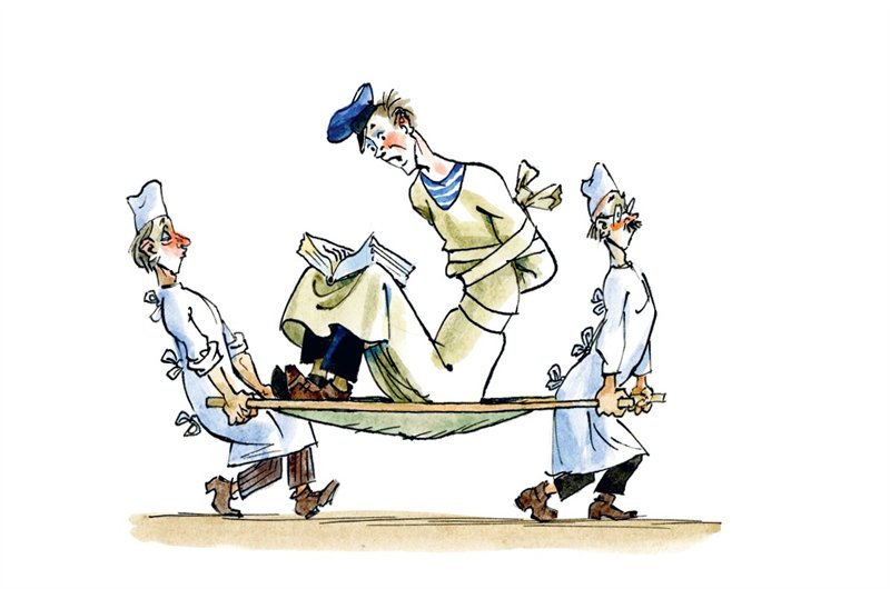 Я отправился. Без труда нашёл квартиру, постучал. И тут, пока я стоял перед дверью, мне совершенно ясно представился Врунгель, обложенный подушками и укутанный одеялами, из-под которых торчит покрасневший от простуды нос.