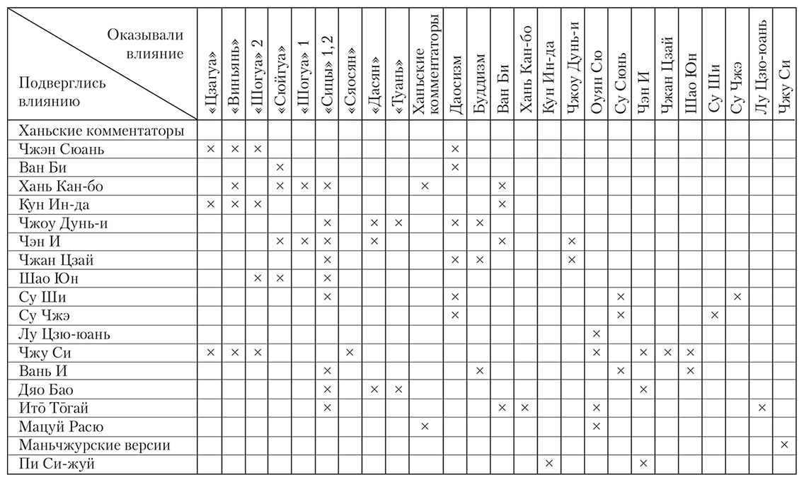 Выбранные мною для иллюстрации Чжу Си и Итō Тōгай – не единственные комментаторы. Это, скорее, два противоположных типа исследователей. На их примере мы видим, что существовали две школы интерпретаторов: школа традиционная и школа критическая. К первой из них приходится отнести таких авторов, как Кун Ин-да, работавшего по заказу правительства, и в меньшей степени – Чэн И-чуаня, а также Чжу Си. Вторая школа представлена в работах Оуян Сю, Дяо Бао, Итō Тōгай и др. Вообще же в комментариях на «Книгу Перемен» далеко не всегда так ярко выступают различия этих школ. Следует иметь в виду, что всегда существовали и комментаторы-эклектики.