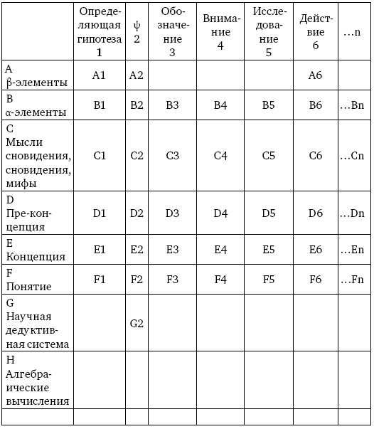 Зрелые взгляды Биона вырабатывались с 1953 по 1967 год. За эти четырнадцать лет он написал восемь статей и три книги. В этот период он достиг некой кульминации своего понимания. Attention and Interpretation (1970), Brazilian Lectures (1990), A Memoir of the Future (1991) и многие другие лекции и семинары в Новом Свете и в Англии (куда он часто приезжал в последние годы жизни) – все были продолжением прозрений, достигнутых в этот крайне важный период, и являются логическим, хотя и богатым художественными образами результатом понимания, достигнутого им в этот центральный для развития его идей период. Кроме того, первое бледное предвестие его зрелой теории можно видеть в работе о группах. Схема, вокруг которой располагаются символы и структура его зрелых идей, – это Таблица. Поэтому концептуально мы расположили Таблицу в центре и в своих рассуждениях будем двигаться от нее к периферии и вновь возвращаться к ней. Многие люди хватаются за голову, впервые увидев Таблицу. Однако усилия, затраченные на попытки ее понять, более чем вознаграждаются. Те, кто проявил упорство и приложил труд, чтобы понять Таблицу, имеют хороший шанс ухватить самую сердцевину идей Биона. В попытке прояснить центральные моменты его понимания аналитического процесса мы проиллюстрируем некоторые аспекты его более поздних работ, но не станем посвящать этому отдельной главы.