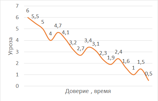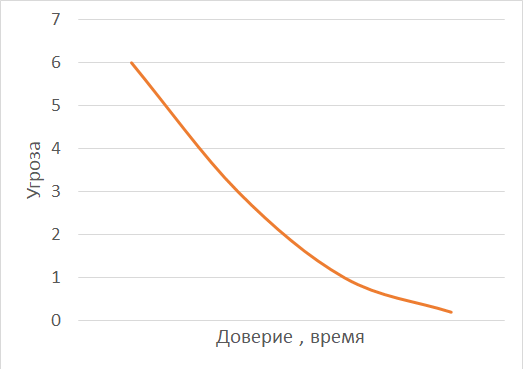 Доверие – это интеллектуальный объект отношений, формирующийся под воздействием мыслительного аппарата в результате взаимодействия в отношениях, являющийся всегда динамичным, показывающий представляемую степень социальной и физической безопасности для субъекта отношений в отношении другого субъекта. Можно сказать, что доверие = допускаемая дистанция для объекта. Формируется доверие во взаимодействии = время + удачные ситуации + потребности + знания + социально-культурные установки + прочие факторы, способствующие росту доверия. Чем меньше вы создаёте какой бы то ни было угрозы для человека, тем на меньшую дистанцию вы можете приблизиться к нему, под дистанцией понимается доступ к приватным интеллектуальным объектам. Вопрос ресурсов будет рассмотрен позже, как вы можете заметить, доверие – один из важнейших ресурсов любых отношений, в любой форме. Рассмотрим принципиальные графики доверия.