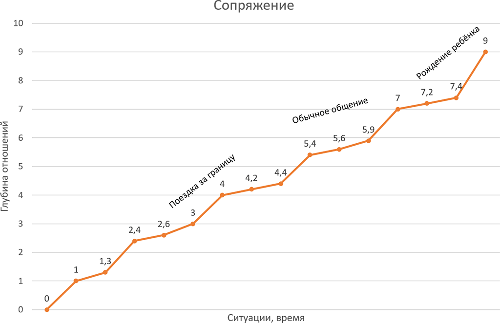 Итак, что же такое «глубина в отношениях». Это есть не что иное, как схожесть интеллектуальных объектов, их можно назвать «совместно нажитыми», они так же, как и доверие, формируются со временем взаимодействия. К примеру, съездили вы вместе с девушкой за границу, у вас сформировался интеллектуальный объект, конечно, они отличаются друг от друга, но всё же гораздо более схожи, чем «не совместно нажитые». С коллегой провели приятно время, с партнёром по бизнесу сделали общий проект и так далее. Всё это есть совместно нажитые объекты, которую уменьшают вашу разницу в объектах, а следовательно, и десинхронизацию, это первое. Второе – это, конечно, знания о своём объекте отношений, т. е. его отношение к тому или иному, взгляды, представления, потребности, цели, знание в области его знаний и т. д., иначе говоря, представления о его интеллектуальных объектах, которыми он оперирует под некоторыми потребностями. Этот процесс можно назвать сопряжением, тогда получается, что глубина отношений – это некоторая величина, определяющая вашу сопряжённость.