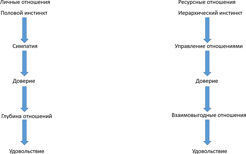 В мире существует крайне мало вещей сложнее отношений (если они есть вообще), физические процессы управляемы (в меру знаний), химические тоже, даже адронный коллайдер является вполне себе устойчивым устройством, чего, конечно, не скажешь о взаимоотношениях, люди настолько разные (в 1–40 раз отличаются в размерах участки головного мозга), что работу с отношением с каждым человеком можно сравнить с научной. И не вздумайте строить иллюзий, что вы знаете или разбираетесь в других людях, это совершенно не так, это иллюзия понимания, порождённая мозгом, никогда не даст вам понять реальность и сложность взаимоотношений в социуме. Мало того, у кого-то есть специфические участки головного мозга, а у кого-то отсутствуют. Исходя из этой разницы, порождённой наследственностью и изменчивостью, которая формирует разнообразие форм мышления, а как следствие, различие людей, можно сказать, что это и плюс, и минус. Плюс заключается в разнообразии отношений и, как следствие, интереса и новизны в них. Минус заключается в том, как же взаимодействовать со столь различными объектами эффективно? Как их понимать? Отвечу сразу – до конца понять невозможно, мы лишь можем приблизиться на дистанцию эффективного взаимодействия и использовать грамотно ресурсы этих отношений. Зная это, вы уже можете предполагать, откуда берутся все проблемы в отношениях, все ссоры, разводы, недопонимания и прочие. Всё дело, конечно, в десинхронизации интеллектуальных объектов и актуализированных в данный момент времени потребностей. Если говорить проще, вы думаете так, а ваш партнёр думает по-другому, вы имеете потребность (в данный момент времени) одну, ваш партнёр другую, соответственно, вы под действием потребности начинаете совершать действия для её удовлетворения, а конкретно просить партнёра или даже требовать с него чего-то.