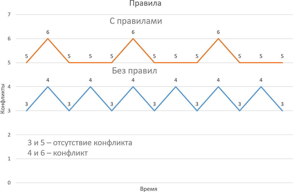 Как же они должны формироваться? Необходимо помнить о невозможности полной синхронизации, всегда будут флуктуации (глава 3) в отношениях или, говоря проще, конфликты, система правил позволяет сводить к минимуму подобные ситуации.