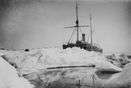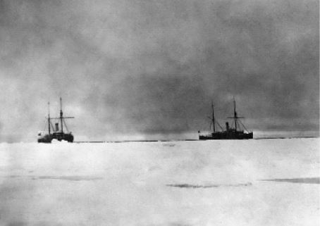 23 июля в полночь мы вошли в Ледовитый океан; была тихая, светлая летняя полярная ночь, льда нигде не было видно, температура воздуха +5…+6,25°. Согласно инструкции нового, молодого начальника, ледоколу «Вайгач» было предложено подняться к островам Врангеля и Геральд, а оттуда, держась возможно севернее, пройти к Медвежьим островам, где была назначена встреча с ледоколом «Таймыр», т. к. последний предполагал идти вдоль берега для производства метеорологических наблюдений в высоких слоях атмосферы. В течение целых суток мы шли на север, не встречая льда, но с 3 ч утра следующего дня стал попадаться лед, а к 8 утра мы уже встретили совершенно непроходимый, мощный, многолетнего образования полярный лед, окончательно преградивший нам дорогу к острову Врангеля. В этом для нас ничего не было удивительного, т. к. вся полярная литература говорит о малодоступности этого острова и картина, которая в 1911 г. нам представилась, не была счастливым исключением. Тогда мы решили отклониться на запад и идти вдоль кромки льда в надежде встретить полынью, идущую по направлению к острову Врангеля. К сожалению, таковой мы не нашли, но зато, пройдя около суток, увидели на горизонте затертое во льдах судно; когда мы подошли ближе, то это оказался какой-то пароход, державший, между прочим, сигналы, но из-за дальности расстояния не было возможности их разобрать. Одно было ясно, что положение этого парохода незавидное: по-видимому, он был затерт льдами и его дрейфовало вместе с ними. Мы немедленно начали пробиваться к пароходу и, хотя лед был густой и мощный, все же с большим трудом понемногу продвигались к нему.