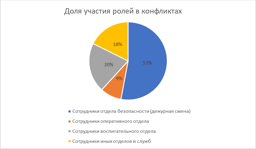 Проведённое исследование показывает, что наибольшая частота пенитенциарных конфликтов (53 %) наблюдается между сотрудниками отдела безопасности (дежурной смены) и осуждёнными. Далее по ранжиру следуют конфликты между сотрудниками воспитательного отдела и осуждёнными (20 %), а завершают перечень конфликты между оперуполномоченными и осуждёнными (9 %). К служащим иных отделов и служб можно отнести медицинский персонал, работников центра трудовой адаптации и тылового обеспечения. С данной категорией лиц пенитенциарные конфликты с длительной криминальной динамикой не фиксируются.