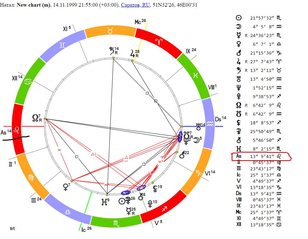 Итак, теперь вы видите личную натальную карту. Нам необходимо найти знак зодиака (а как мы знаем их всего 12), в котором находится асцендент (As) в правой табличке и непосредственно на самой карте (выделено красным).