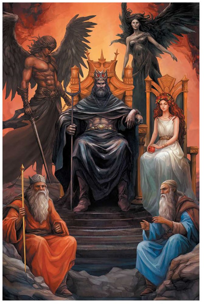 Мрачный Аид в окружении Персефоны, судей Миноса и Радаманта и бога смерти Таната.