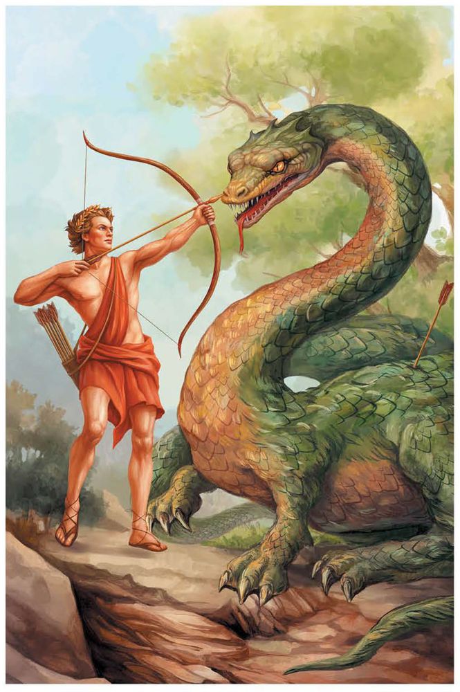 Златокудрый Аполлон сражается с ужасным драконом Пифоном.