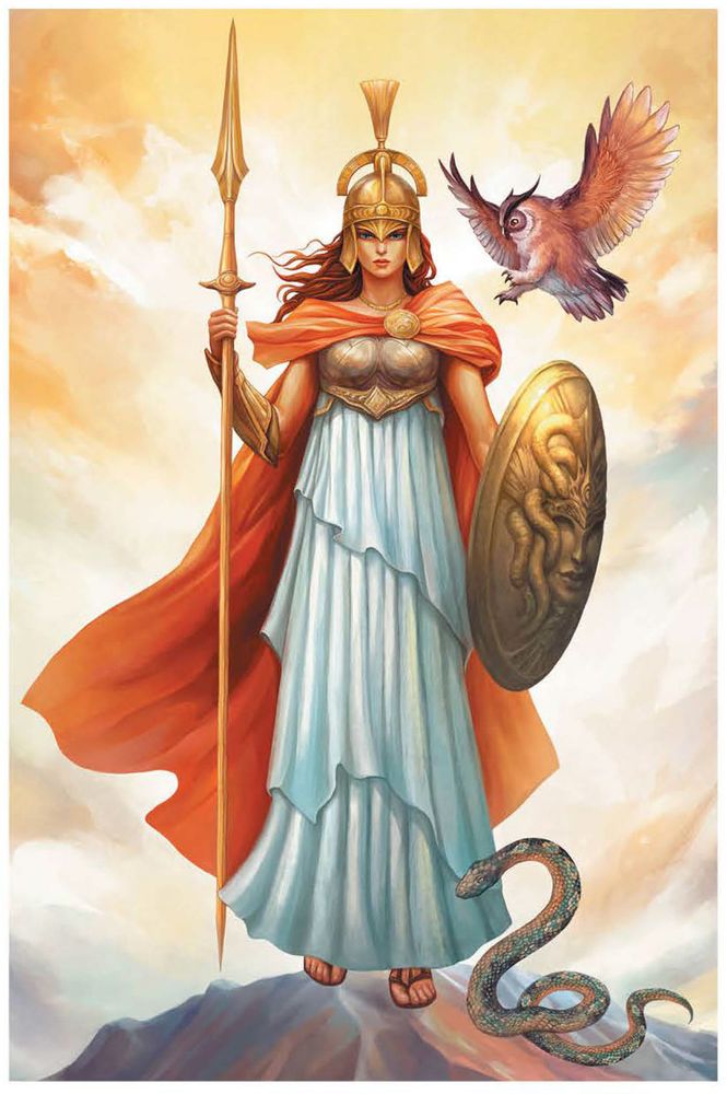 Могучая воительница Афина-Паллада в блестящем шлеме, с копьём и щитом.