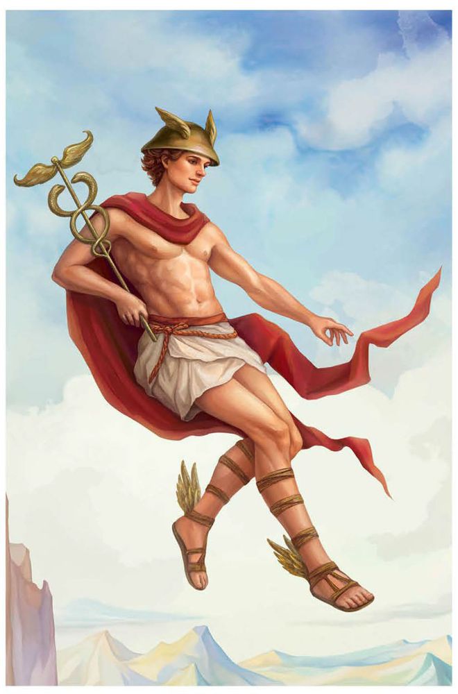 Гермес летает среди облаков в крылатых сандалиях и с жезлом-кадуцеем.