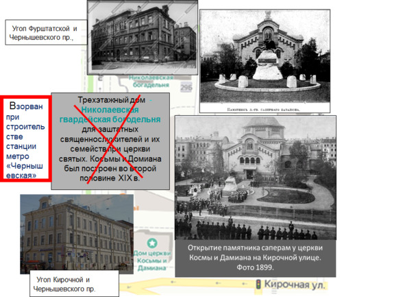 Участок расположен напротив дома 40 по улице Фурштатской, в котором я проживал более 40 лет, и до этого случая даже не подозревал, какую богатую историю имеет это место. К 1900 году на этом месте сформировалась церковная слобода. В ее центре находилась батальонная церковь Косьмы и Дамиана.