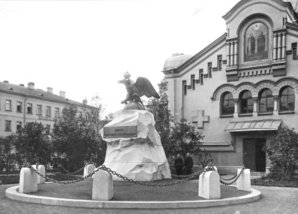 Фотографии трехэтажного дома Николаевской гвардейской богадельни мне найти не удалось. Зато фотографий памятника «Подвигам лейб-гвардии Саперного батальона» сохранилось несколько. Этот памятник был установлен июне 1899 года перед церковью со стороны Кирочной улицы.