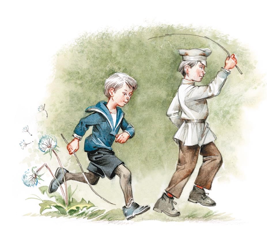 Но вот брату наскучивает это занятие. Он закидывает палку на крышу дома и, не сказав ни слова, бросается куда-то бежать. Я тоже кидаю палку на крышу. Но палка не долетает до крыши, а, ударившись о стенку дома, отскакивает и летит прямо в меня. Повернувшись, я удираю от палки, но она догоняет меня и стукает по спине. Не обращая на это особенного внимания, я бегу вслед за братом, путаясь ногами в высокой траве.