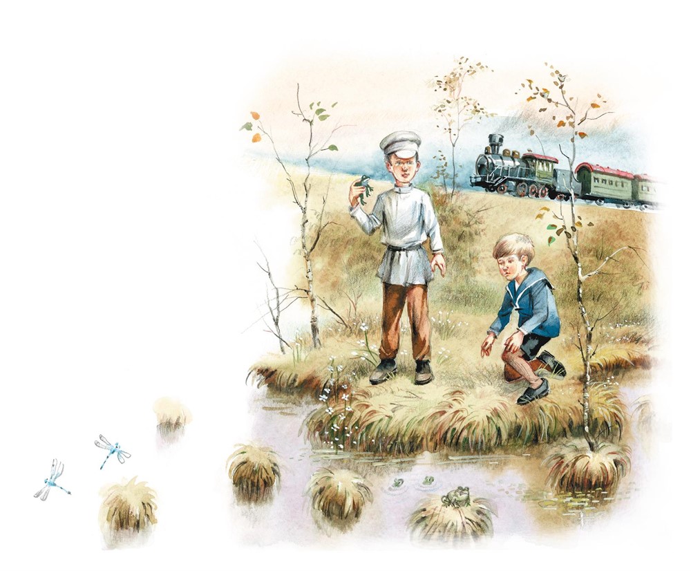 Однако не незабудки влекут сюда брата, а нечто иное: лягушки. Их тут полно. Настоящее лягушиное царство. Брат очень ловко умеет справляться с ними. Зажав пойманную лягушку в кулаке, он высоко поднимает руку кверху и с силой бросает лягушку на землю. Бац! Лягушка остаётся лежать без движения.