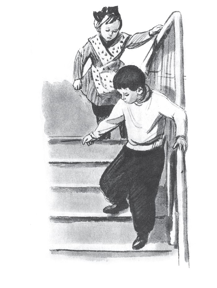 Валя побежала обратно к лестнице, а Петя всё ступеньки считает: