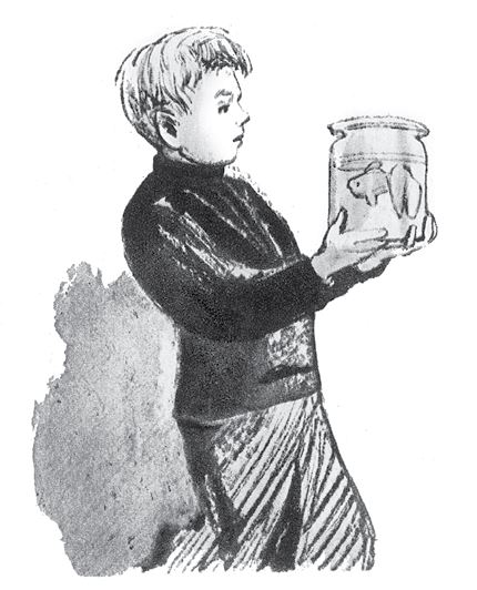 Виталик поскорей налил в кружку воды. Серёжа посадил карася в кружку. Ребята пошли к Серёже – сажать рыбку в банку. Банка оказалась не очень большая, и карасику в ней было не так просторно, как в аквариуме. Ребята долго смотрели, как карасик плавает в банке. Серёжа радовался, а Виталику было жалко, что теперь у него не будет рыбки, а главное, он боялся признаться маме, что променял карасика на свисток.