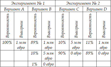 Представьте себе Вам предлагают вначале сделать выбор. Вариант А: со 100 % вероятностью вы получаете 1 миллион евро. Вариант В: с вероятностью в 89 % вы получаете тот же 1 миллион евро, с вероятностью в 10 % вы выигрываете 5 миллионов евро, и с вероятностью в 1 % вы ничего не получаете. Что вы выберите? А или В?