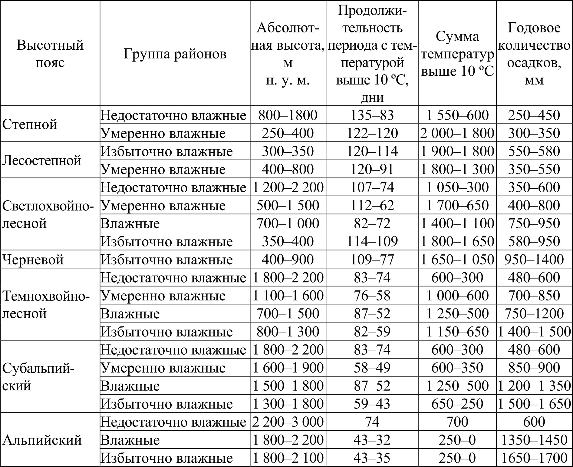 Отличительной чертой высотного спектра является черневой низкогорный пояс из пихты, кедра и осины, окаймленный снизу полосой черневых осинников, замещающих здесь, в предгорьях Саян, субнеморальные хвойно-широколиственные формации восточноевропейского типа. Их типологический состав, структура, процессы почвообразования и климатические особенности достаточно хорошо изучены к настоящему времени (Типы лесов.., 1980; Поликарпов, Чебакова, Назимова, 1986), а в системе экологофлористической классификации они отнесены к классу Querco-Fagetea Br.-Bl. et Vlieger in Vlieger, 1937 (Ермаков, 2006). Уникальный характер этих лесов, как и всего спектра растительных поясов, вплоть до высокогорий, отмеченный многими исследователями, связан с избыточно влажным (пергумидным) климатом, определившим господство крупнотравья, вейников и папоротников, а из кустарничков – только черники. Наиболее близким аналогом этих лесов можно считать только кедровники северовосточного Алтая и пихтарники Кузнецкого Алатау (западного макросклона), хотя отличие последних – отсутствие или очень небольшая примесь кедра в пихтарниках при более высокой доле ели.