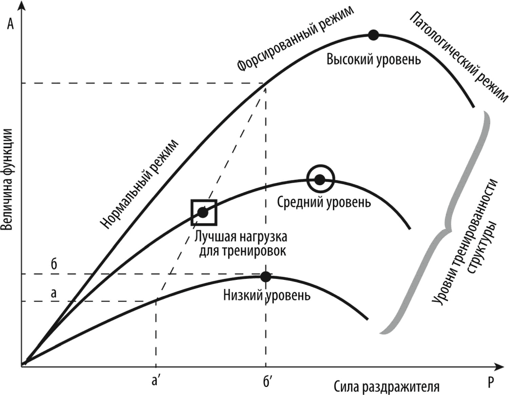 Над верхней кривой для самой тренированной клетки обозначены три режима: нормальный, форсированный и патологический. Что это такое? Названия говорят сами за себя. Нормальный режим обеспечивает среднюю интенсивность деятельности клетки, он устойчив и не ограничен во времени. Все химические реакции хорошо сбалансированы и не напряжены. На кривых мы видим линейную зависимость между силой раздражителя и возрастанием функций.