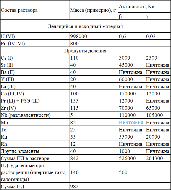 Состав раствора, полученного при растворении 1000 кг урана с глубиной выгорания до 1000 МВт•сут/т, время выдержки – 100 сут.