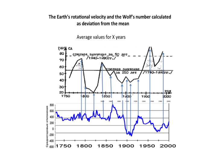 Notice, how the combination of turns in the Earth's rotational speed and intensity of solar radiation is consistent. The low values of solar intensity on turns are consistent with high values in turns of gravity-spin energies, energies of the cosmic ether. It is the ratio of these energies had been substantiated by V. Dyatlov through the law of the full electromagnetic and gravity-spin currents. According to his calculations, the gravity-spin energy growth is combined with falling of electromagnetic energy if we are talking about a separate cosmic system. In his terminology it is vacuum domain. But it is on the scale of centuries.