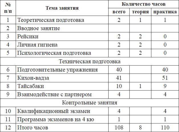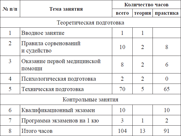 Психологическая подготовка. Содержит в себе курс обучения саморегуляции психологического состояния, уроки психологической подготовки. Данная тема затрагивается крайне осторожно и при постоянных консультациях с родителями учеников.