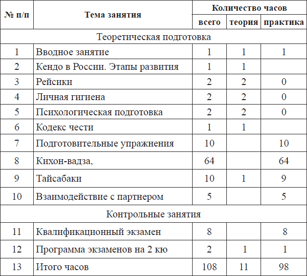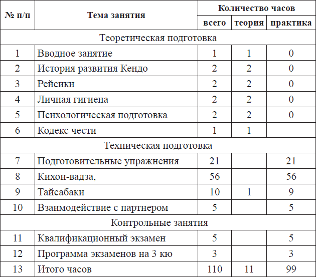 Основные темы теоретической подготовки на учебно-тренировочном этапе: история физической культуры, история Кендо и других боевых искусств, философские основы «будо», методические особенности построения тренировочного процесса, закономерности развития человеческого организма.