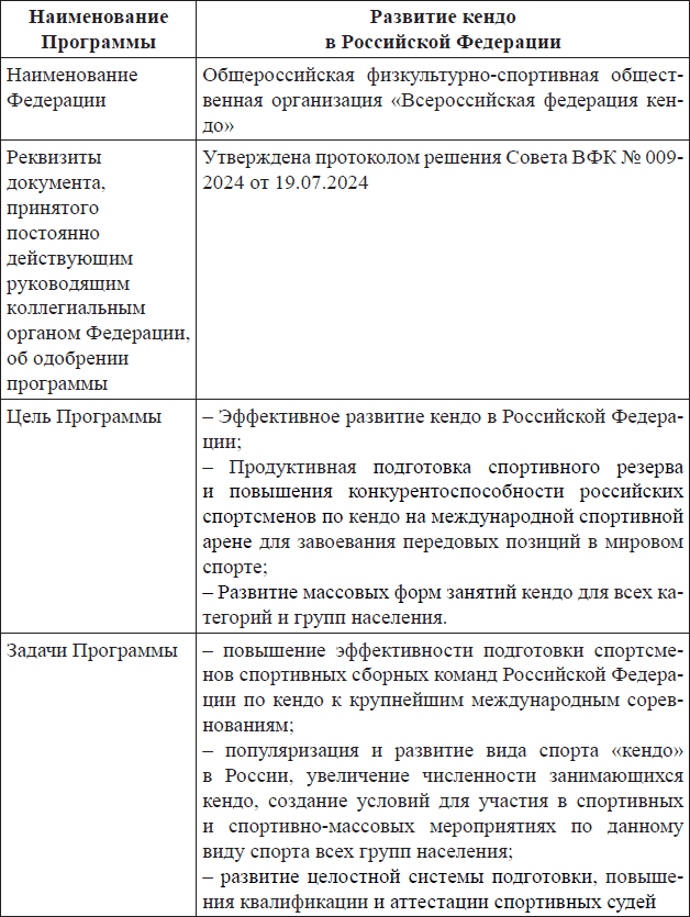 1. Паспорт программы развития вида спорта «кендо» в Российской Федерации