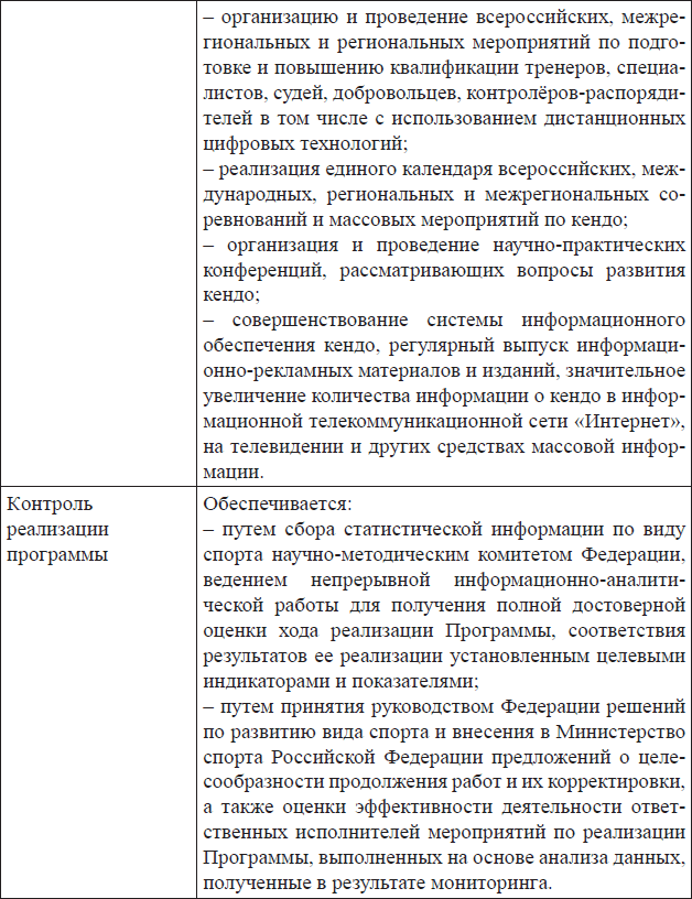Ход и результаты реализации Программы рассматриваются на заседаниях руководящих органов Общероссийской физкультурно-спортивной общественной организации «Всероссийская федерация кендо», а также экспертным советом и соответствующими подразделениями Министерства спорта Российской Федерации. Регулярный контроль выполнения намеченных мероприятий, проведение обобщенного анализа полученных данных позволит, в случае необходимости, своевременно корректировать Программу.