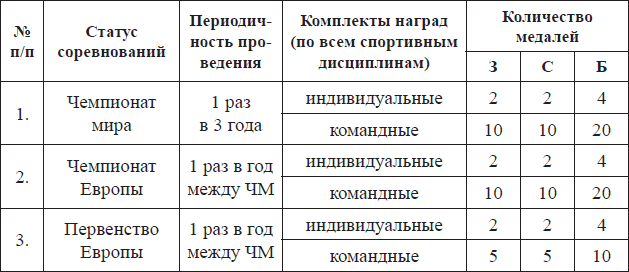 Проводятся следующие международные спортивные соревнования, на которых разыгрываются следующие комплекты наград: