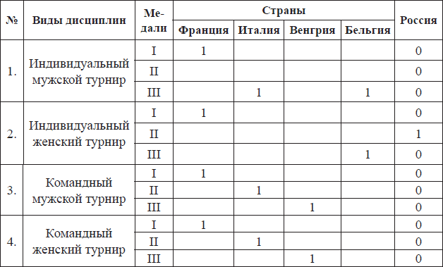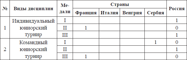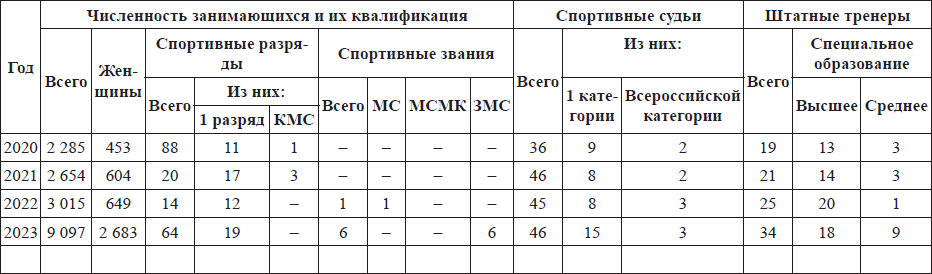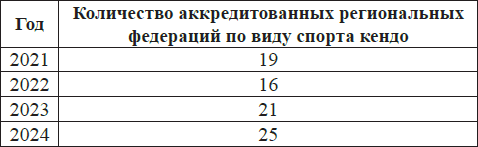 Анализ показателей, представленных в таблице, позволит выявить особенности территориального распределения спортсменов по спортивным специализациям, количество штатных тренеров, а также охарактеризовать перспективы развития вида спорта «кендо» в регионах Российской Федерации.