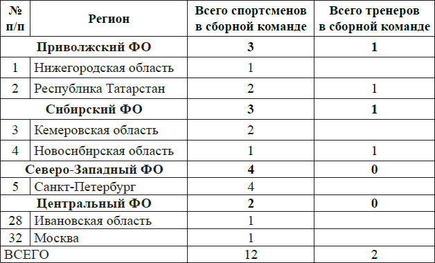 Проводя анализ состава спортивной сборной команды России по виду спорта «кендо» на 2024 год (Таблица 9), видно, что в её составе представлены спортсмены из 7 субъектов Российской Федерации, представляющие четыре федеральных округа.