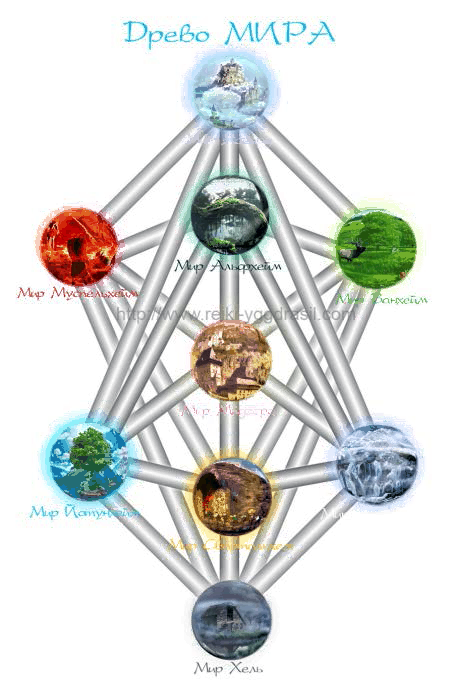 Мировое Древо Иггдрасиль – это строение сознания самой Вселенной, имеющее кристаллическую структуру. В основе Древа Иггдрасиль находится центральная ось (ствол), включающая в себя миры Хель, Свартальхейм, Альфхейм и Асгард, вокруг которой формируется энергетическое пространство (корни и ветви), вмещающее в себя все многообразие миров – Муспельхейм, Нифельхейм, Мидгард, Ванхейм и Йотунхейм.